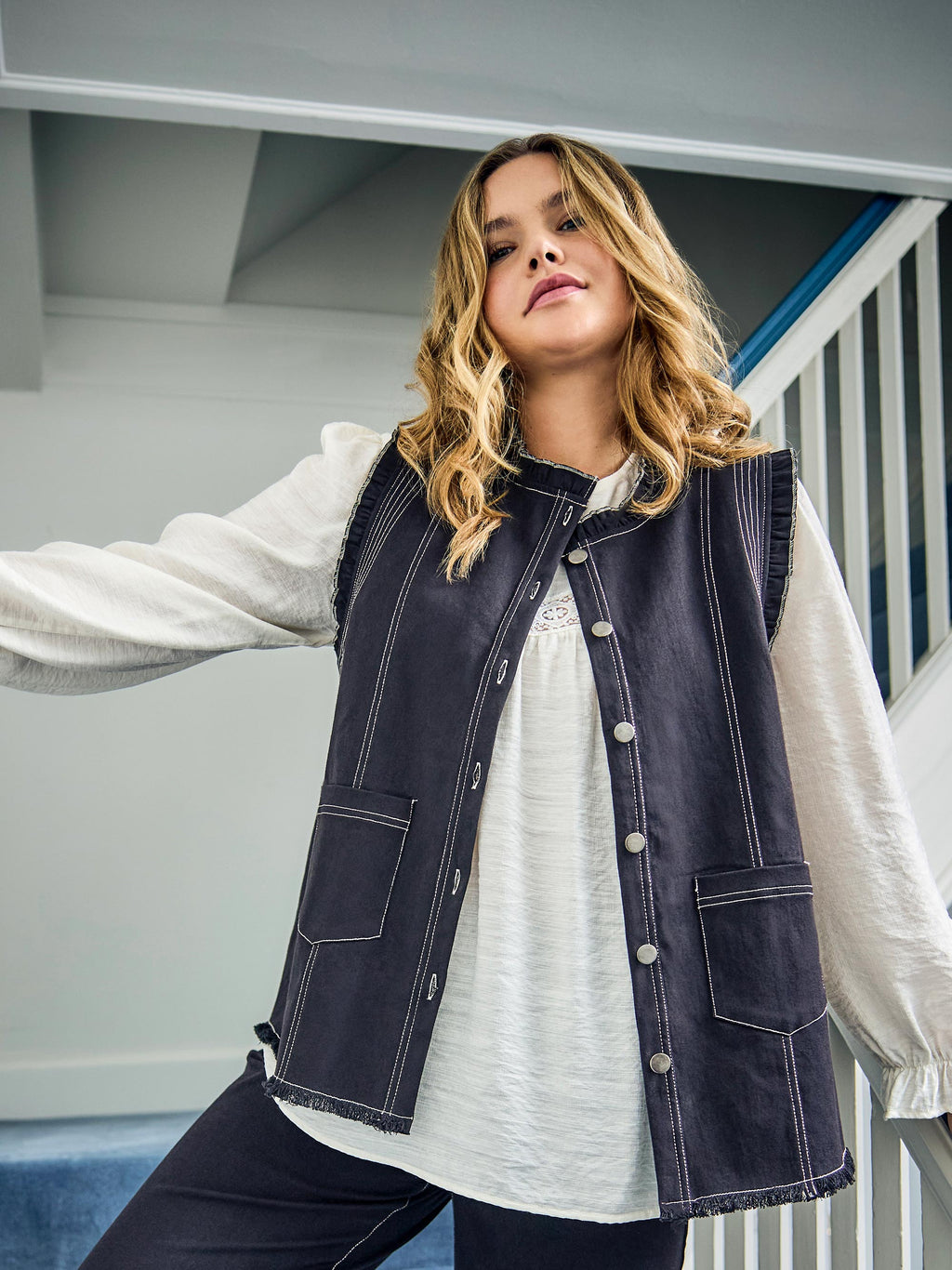 make it perfect for layering over your favorite blouse or dress. Feminine ruffle details at the armholes and neckline add a playful touch, while dark silver denim buttons provide a sleek closure. Finished with contrast cream stitching that gives the piece a modern edge.Heavy black denimCan be worn as top or vestDeep armholes – ideal for layeringRuffle details at armholes and necklineDark silver denim buttonsContrast cream stitching