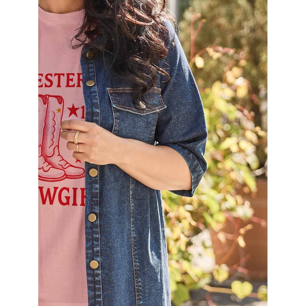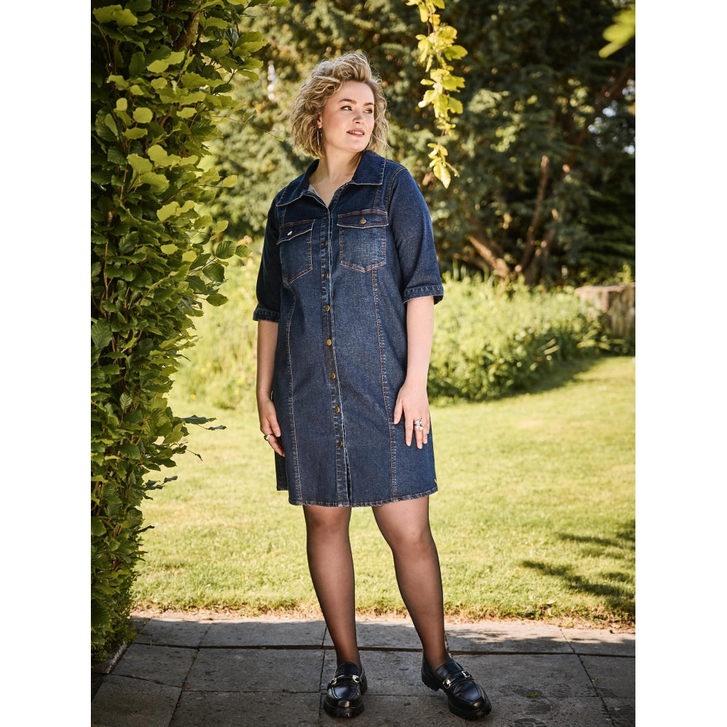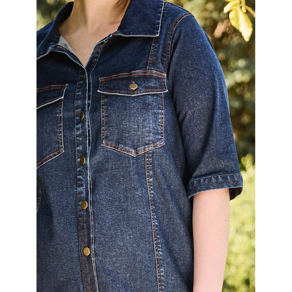 The Ivy Shirt Dress combines a classic shirt dress design with a modern and relaxed twist. Made from lightweight denim, this plus size dress offers a trendy yet timeless look.It features chest pockets and sleeves that fall below the elbows for a relaxed fit. The full button closure and classic collar add structure, while the comfortable silhouette ensures a flattering drape.Wear it on its own or style it with boots and accessories for a bold, fashion-forward look.Highlights:Plus size denim shirt dressLightweight denim fabricChest pocketsClassic collar and button closureComfortable and flattering fitVersatile everyday style