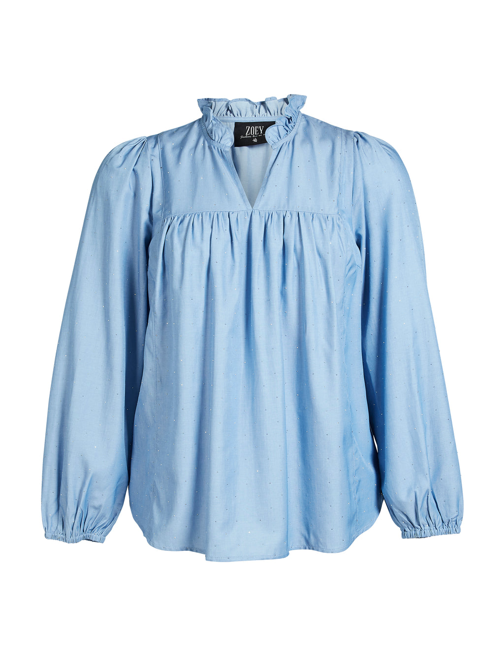 The delicate ruffle collar and V-neckline create a feminine expression, while the sparkling stones in the fabric add a subtle shimmer and exclusive finish. The blouse features a relaxed fit with lightly puffed sleeves that end in elastic cuffs, giving it an airy drape and comfortable wear.The lightweight material makes it pleasant to wear all day – perfect for casual everyday looks with jeans or more elegant styling with a skirt or tailored trousers.• Gathered yoke and ruffle collar with V-neck• Long sleeves with extra width and elastic cuffs• Lightweight and comfortable quality• Sparkling stones in the fabric• Feminine and versatile design – easy to dress up or down