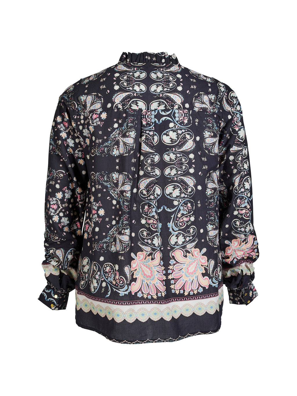 Add a touch of elegance to your wardrobe with this beautiful blouse in a deep navy shade, adorned with a detailed paisley and floral print in soft pastel colors. The blouse features a relaxed fit, long sleeves with subtle gathering at the cuffs, and a feminine stand-up collar with a delicate ruffle trim. The open V-neckline adds a modern and airy look. Perfect for both everyday wear and special occasions – style it with jeans for a casual vibe or with tailored trousers for a more sophisticated outfit.