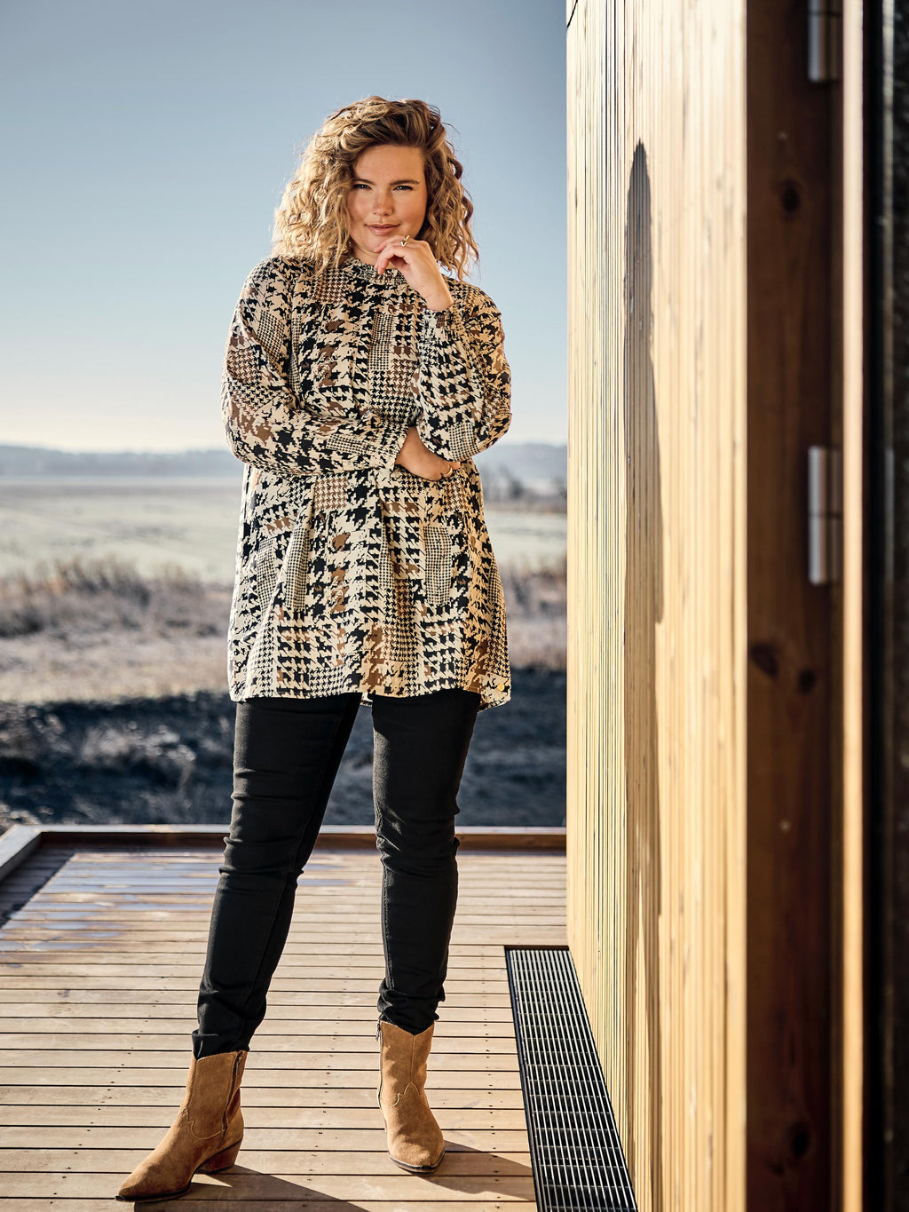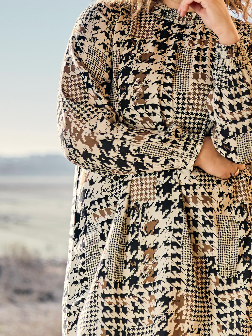 Upgrade your wardrobe with this stylish tunic featuring a modern patchwork design with classic houndstooth patterns in neutral shades of black, white, and brown. The tunic offers a loose and comfortable fit, long sleeves with elastic cuffs, and a small stand-up collar for an elegant touch. The lightweight fabric ensures maximum comfort, making it perfect for both everyday wear and more formal occasions. Style it with leggings or slim jeans for a relaxed look, or pair it with tailored trousers for a sophisticated outfit.Details:• Black, white, and brown in patchwork houndstooth design• Lightweight and comfortable fabric• Loose and relaxed fit• Long sleeves with elastic cuffs• Neckline: Small stand-up collar