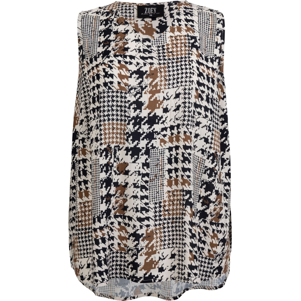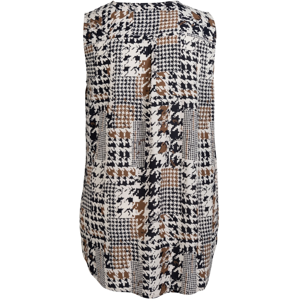 Add a modern twist to your wardrobe with this stylish sleeveless top featuring a unique patchwork design with classic houndstooth patterns in black, white, and brown. The top offers a loose and comfortable fit, a round neckline, and front button closure, creating an elegant and versatile look. The lightweight fabric ensures all-day comfort, making it perfect for both everyday wear and more formal occasions. Style it with jeans for a relaxed outfit or with tailored trousers and a blazer for a sophisticated appearance.Details:• Black, white, and brown in patchwork houndstooth design• Lightweight and comfortable fabric• Loose and relaxed fit• Sleeveless• Round neckline• Front button closure