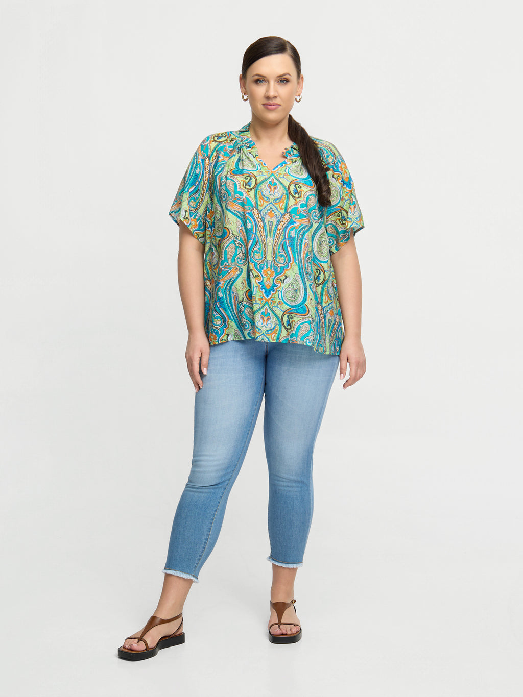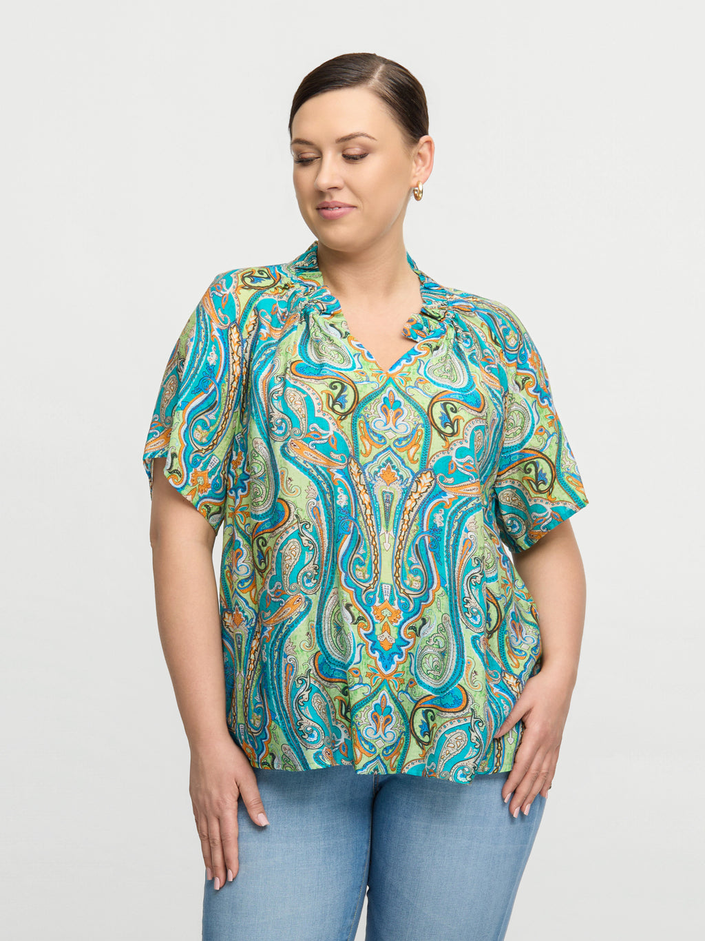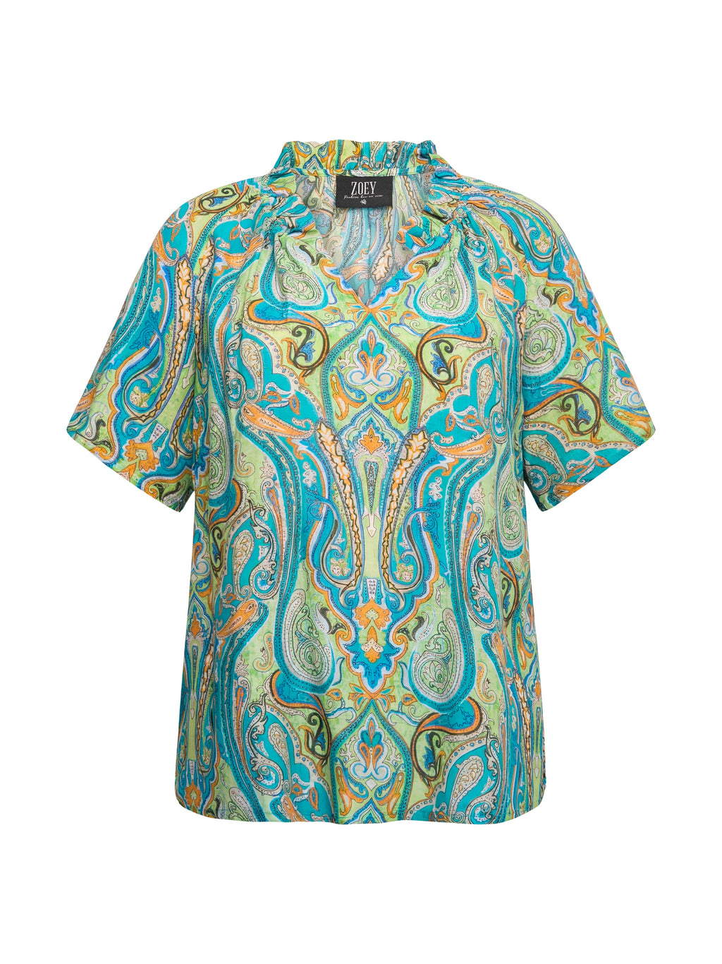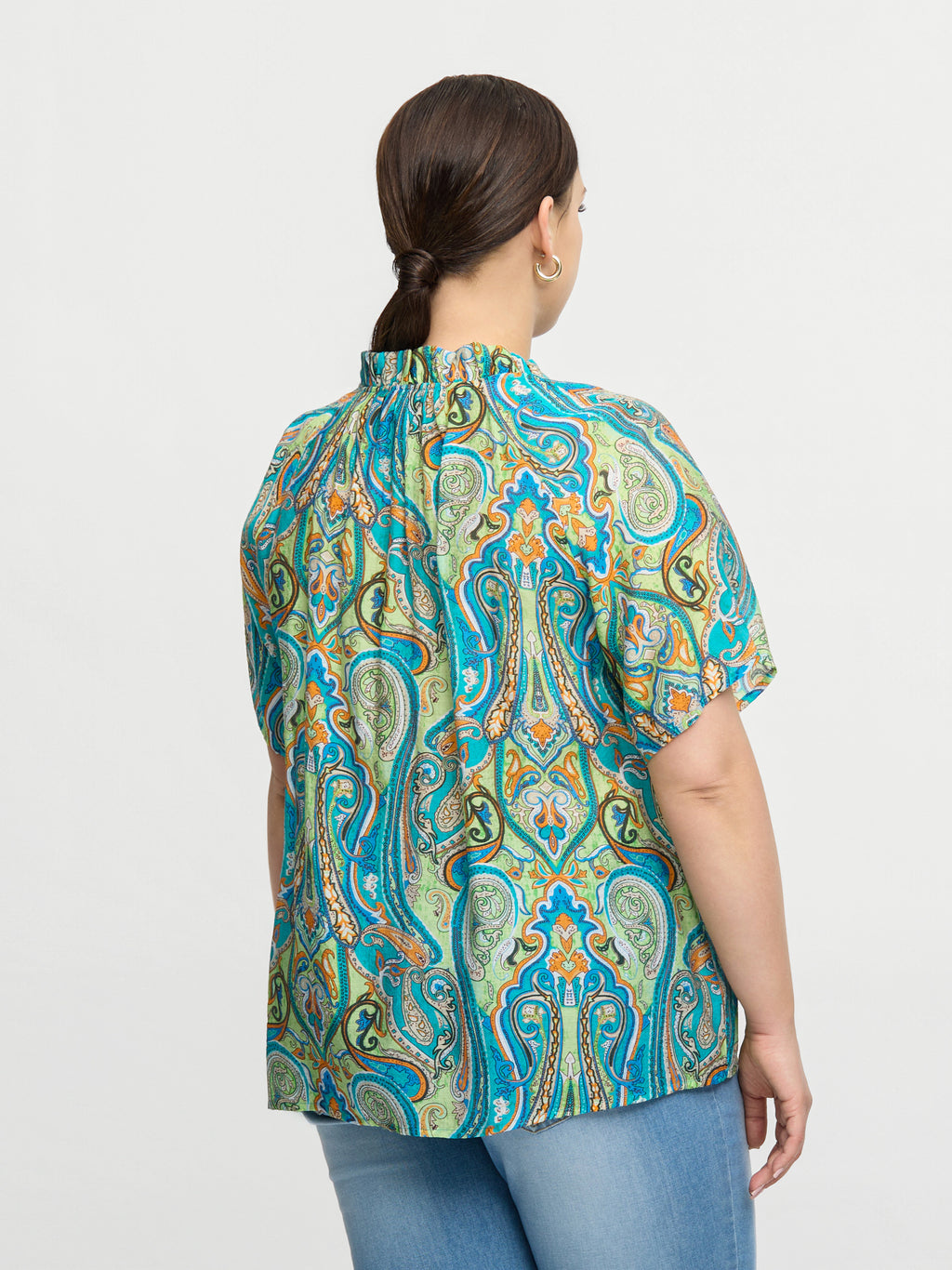 This elegant blouse is crafted from a light and airy fabric that drapes beautifully and feels soft against the skin. The delicate paisley print creates a vibrant and summery look, adding color and personality to your wardrobe.The blouse features short sleeves and a loose fit, creating a relaxed and flattering silhouette. The high neckline with ruffle detail and tie strings adds a feminine touch, while the soft gathers create a gentle drape.Perfect for both everyday wear and special occasions – style it with jeans, trousers, or a skirt depending on the look.Available in two beautiful colors.Details:Lightweight and airy fabricPaisley printHigh neckline with ruffle detailTie strings at the neckShort sleevesLoose and comfortable fitAvailable in two colors