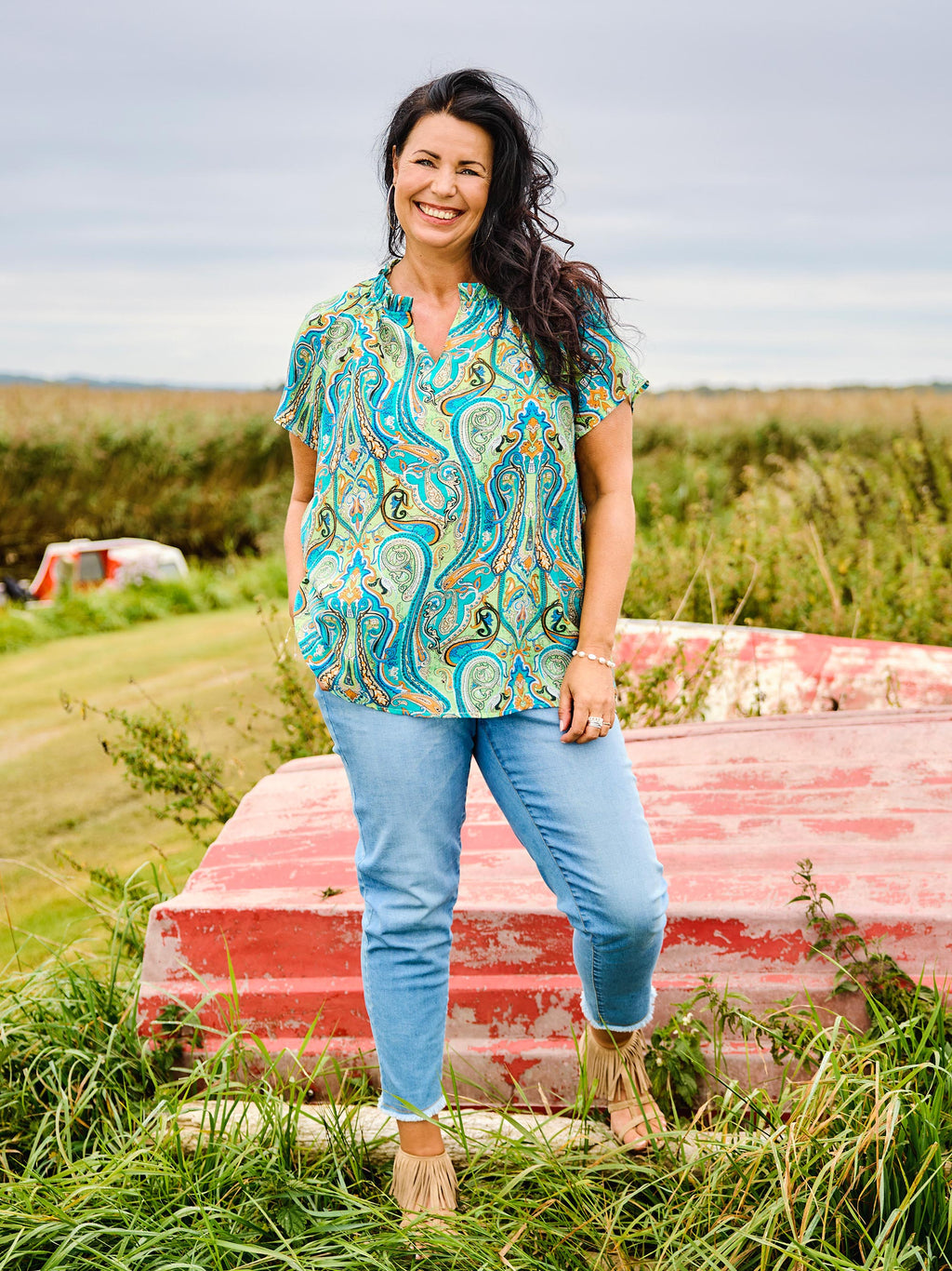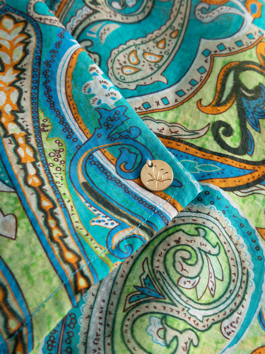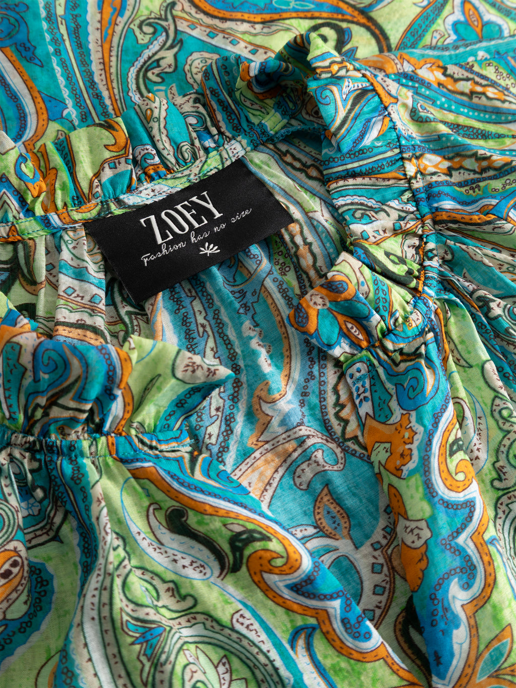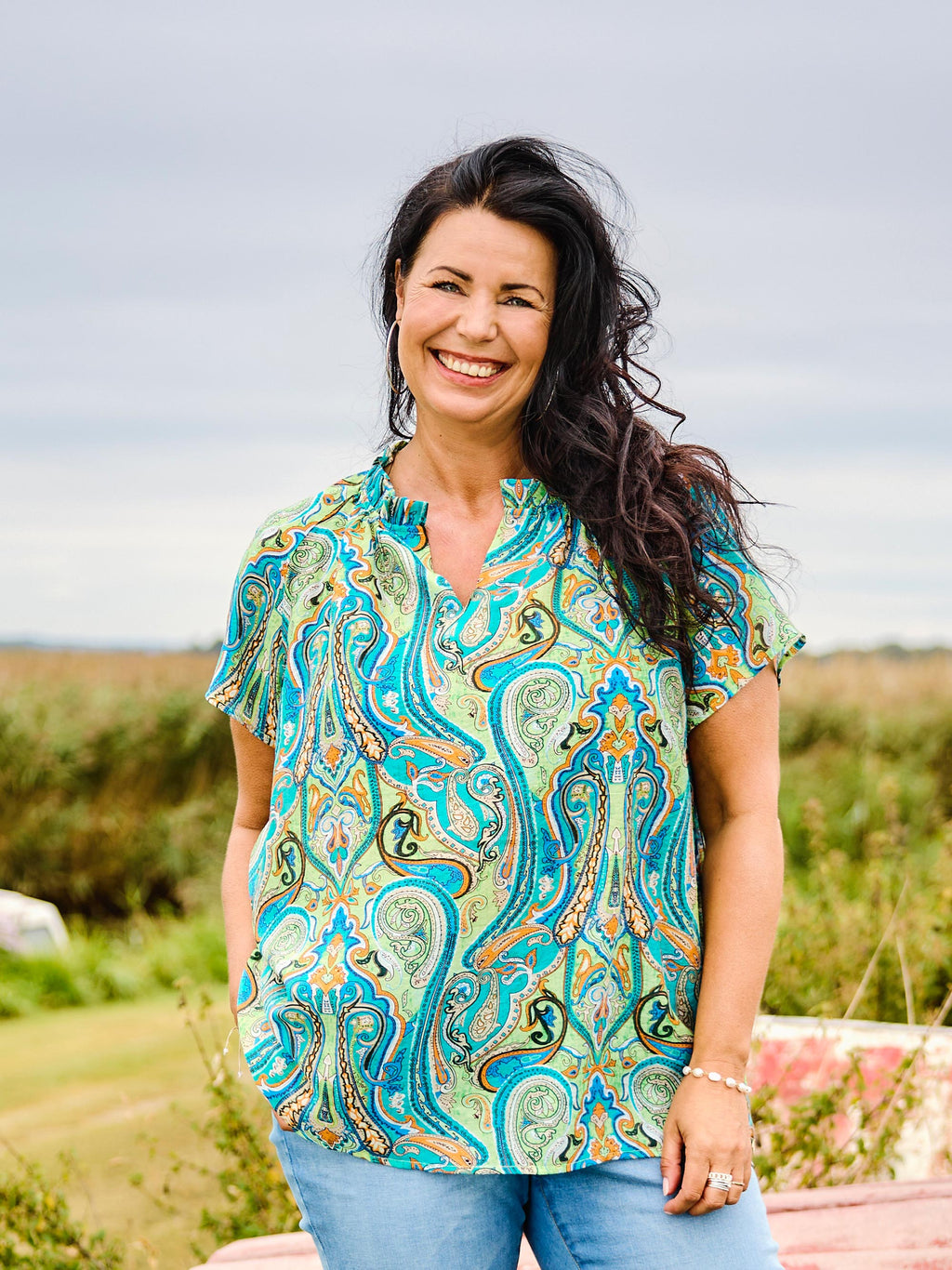 This elegant blouse is crafted from a light and airy fabric that drapes beautifully and feels soft against the skin. The delicate paisley print creates a vibrant and summery look, adding color and personality to your wardrobe.The blouse features short sleeves and a loose fit, creating a relaxed and flattering silhouette. The high neckline with ruffle detail and tie strings adds a feminine touch, while the soft gathers create a gentle drape.Perfect for both everyday wear and special occasions – style it with jeans, trousers, or a skirt depending on the look.Available in two beautiful colors.Details:Lightweight and airy fabricPaisley printHigh neckline with ruffle detailTie strings at the neckShort sleevesLoose and comfortable fitAvailable in two colors