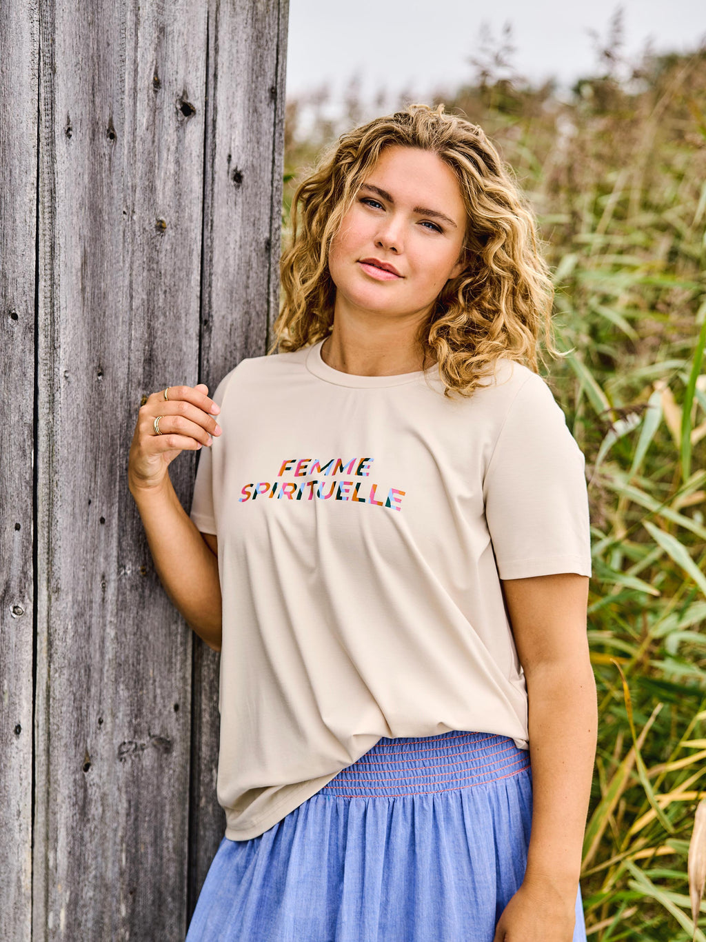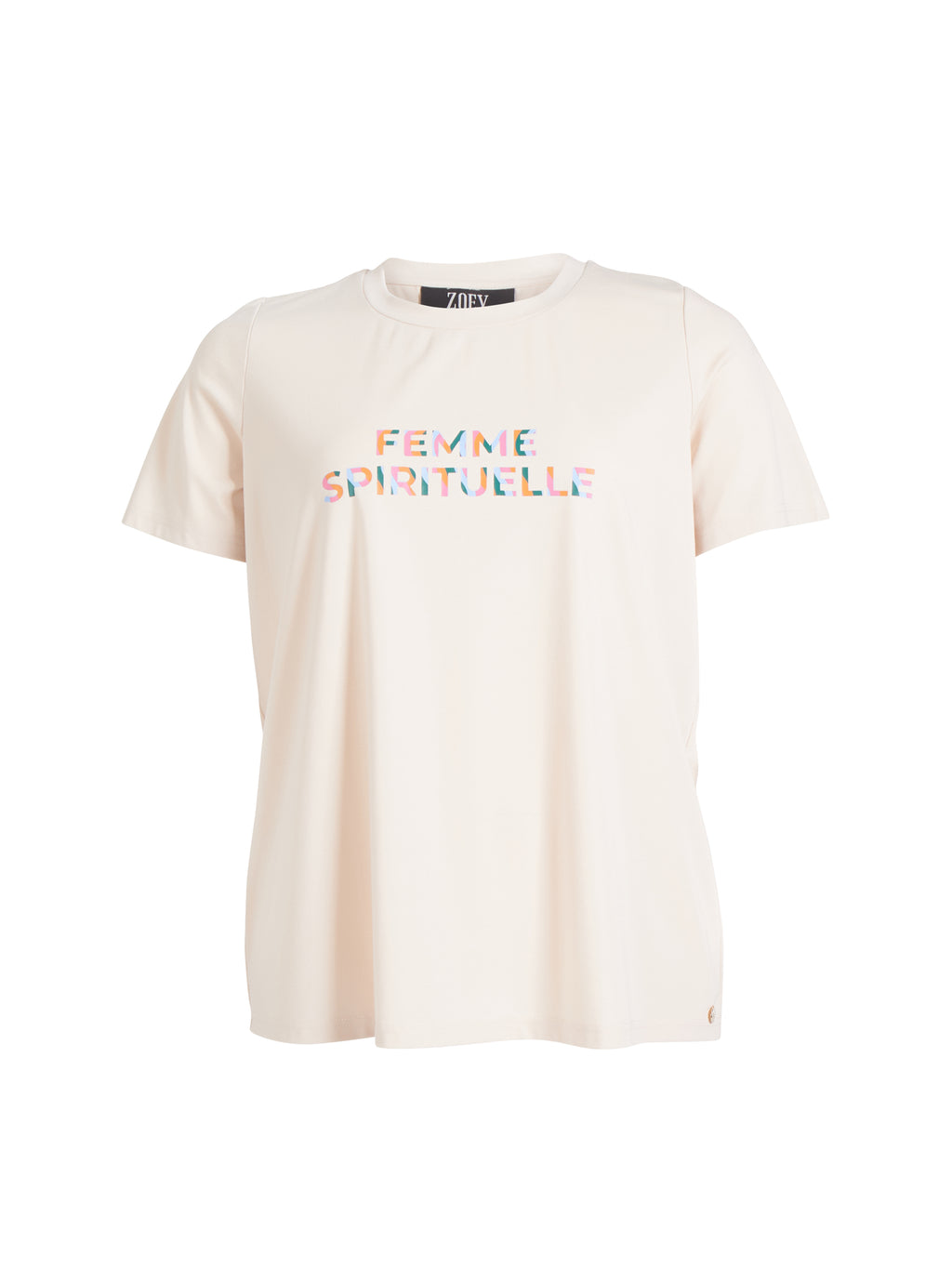 This clean and modern T-shirt combines comfort with a bold statement. It is made from a soft and lightweight fabric, ensuring all-day comfort.The T-shirt features a classic round neckline and short sleeves, while the colorful “FEMME SPIRITUELLE” print at the front adds a unique and eye-catching touch. The loose fit creates a relaxed look that is easy to style.Perfect for everyday wear – pair it with jeans, shorts, or a skirt for a cool and effortless outfit.Details:Soft and lightweight fabricRound necklineShort sleevesStatement print at the frontLoose and comfortable fit